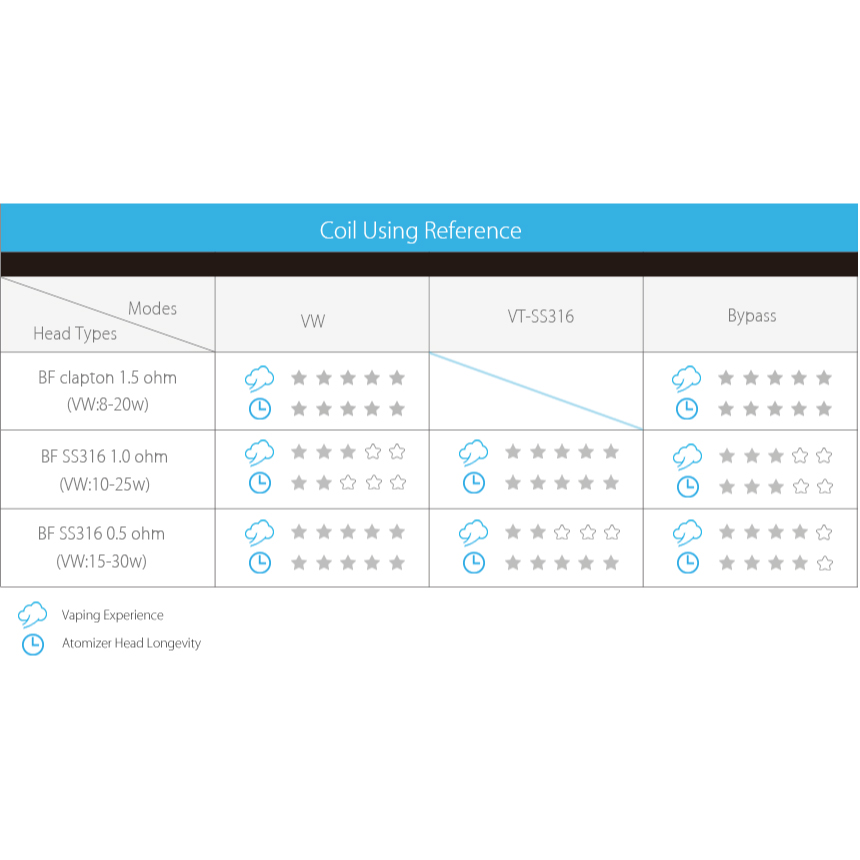Beim Sub-Ohm Dampfen fließen sehr hohe Ströme, das kann zur Überhitzung bzw. Ausgasung der Akkuzelle führen. Bitte stellen Sie sicher das nur geeignete Akkuzellen (Hochstrom ab 20A z.B. Sony oder LG) und Akkuträger mit Schutzelektronik zum Einsatz kommen. Prüfen Sie vor Benutzung, ob Ihr Akkuträger für Sub Ohm Verdampfer und ggf. für Temperaturregelung geeignet ist. Bei Verwendung von Ni- oder Ti-Verdampferköpfen ohne Temperaturregelung, kann die Wicklung des Verdampferkopfes beschädigt werden.